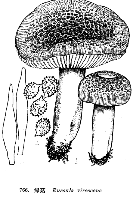 子实体中等至稍大。菌盖直径3-12cm,初期球形,很快变扁半球形并渐伸展,中部常稍下凹,不粘,浅绿色至灰绿色,表皮往往斑状龟裂,老时边缘有条纹。菌肉白色。味道柔和,无特殊气味。菌褶白色,较密,等长,近直生或离生,具横脉。菌柄长2-9.5cm,粗0.8-3.5cm,中实或内部松软。孢子印白色。孢子无色,近球形至卵圆形或近卵圆形,有小疣,可联成微细不完整之网纹,6.1-8.2(9.8)μm×5.1-6.7(7.3)μm。褶侧囊体较少,梭形,有的顶端分叉,状如担子小梗,46-70μm×5.5-10.7μm。