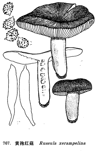 图 767 黄孢红菇 : 1. 子实体, 2. 孢子, 3. 囊体