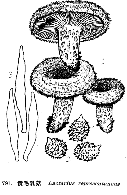 子实体大,橘黄色。菌盖直径6-15cm,初期半球形,后渐平展中部下凹呈漏斗状,湿时粘,具丛毛状鳞片,中部近光滑色深呈土黄色,有同心环带或环纹,且往往不很明显,边缘幼时内卷而丛毛多又长。菌肉硬脆,近白色,伤处变浅酒紫色,具辣味。乳液白色而多。菌褶延生,较密,不等长,淡黄色,伤处变淡紫色,分叉。菌柄长4-11cm,粗2-3cm,基部稍膨大,同盖色,具明显凹窝,内部松软至变空心。孢子印白色。褶侧囊体梭形,顶端细长,70-80μm×5-10μm。孢子宽椭圆形,具疣刺和脊棱,8-11μm×7-9μm。图例