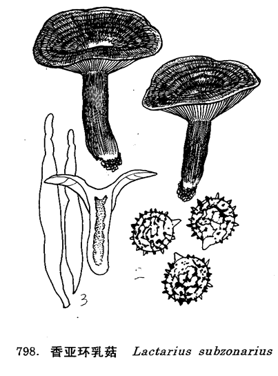 子实体小。菌盖直径2-4cm,初期近扁平,中部下凹,呈脐状,后渐呈漏斗状,表面平滑,不粘,淡褐红色,有明显的肉桂褐色同心环纹或环带。菌肉较厚,带浅褐色,干后具芳香气味,乳汁白色,不变色。菌褶稍延生至延生,密,不等长,有时分叉,浅肉色至淡褐红色,受伤处稍变褐色。菌柄近圆柱形,或有时稍扁,长2.5-3.5cm,粗0.5-1cm,表面有皱纹和白色粉,基部褐色有白细毛,内部空心。孢子印乳黄色。孢子近球形,无色,具剌和小疣,有不完全的网纹,6.5-9.3μm×5.8-8.5μm。褶缘囊体近圆柱形,上部常缢缩,顶端细或稍尖,无色,25-45μm×4.5-6μm。图例