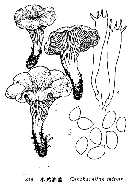 图 813 小鸡油菌 : 1. 子实体, 2. 孢子, 3. 担子