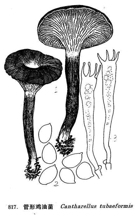 子实体小。菌盖直径2-6cm,初期扁半球形,后近扁平,中部深下凹,有时近漏斗形,边缘呈波状或内卷,有丝状纤毛或粗糙,淡黄褐色。菌肉浅黄色,薄。菌褶延生,稀而呈条棱状,褶缘钝,具分叉或褶间有明显脉纹相连,淡黄褐色至浅灰黄色。菌柄长2.5-6cm,粗0.3-0.7cm,圆柱形,淡黄色至赭色,基部近白色,表面光滑,内部实心变至空心。孢子印白色。孢子椭圆形或宽椭圆形,带淡黄色,璧薄,7-13μm×5-9μm。图例