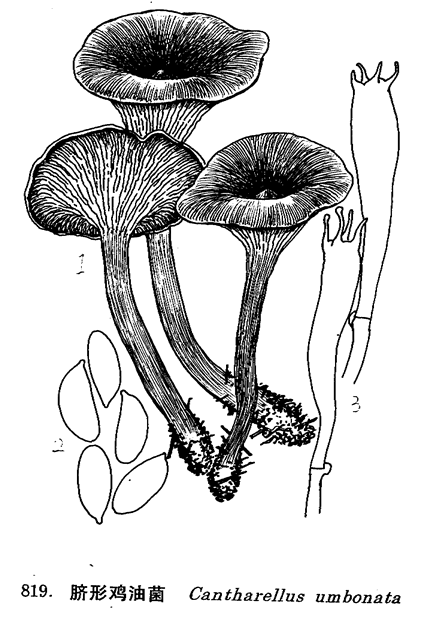 图 819 脐形鸡油菌 : 1. 子实体, 2. 孢子, 3. 担子