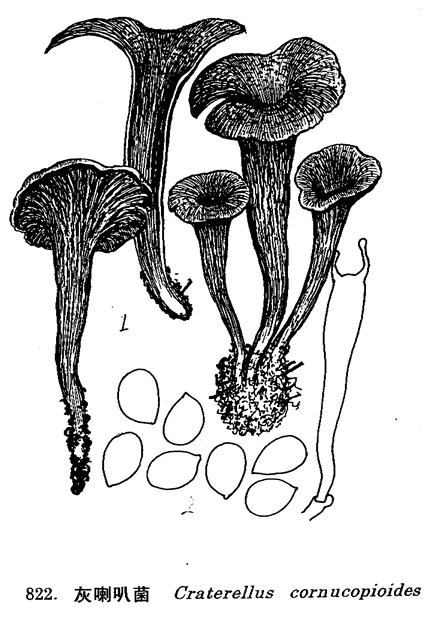 图 822 灰喇叭菌 : 1. 子实体, 2. 孢子, 3. 担子