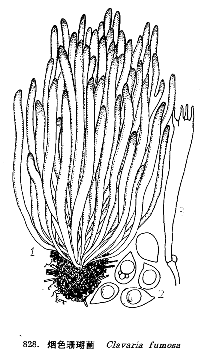 图 828 烟色珊瑚菌 : 1. 子实体, 2. 孢子, 3. 担子