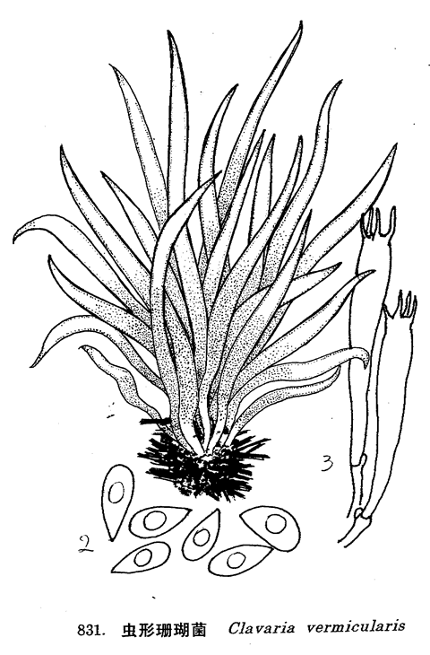 图 831 虫形珊瑚菌 : 1. 子实体, 2. 孢子, 3. 担子