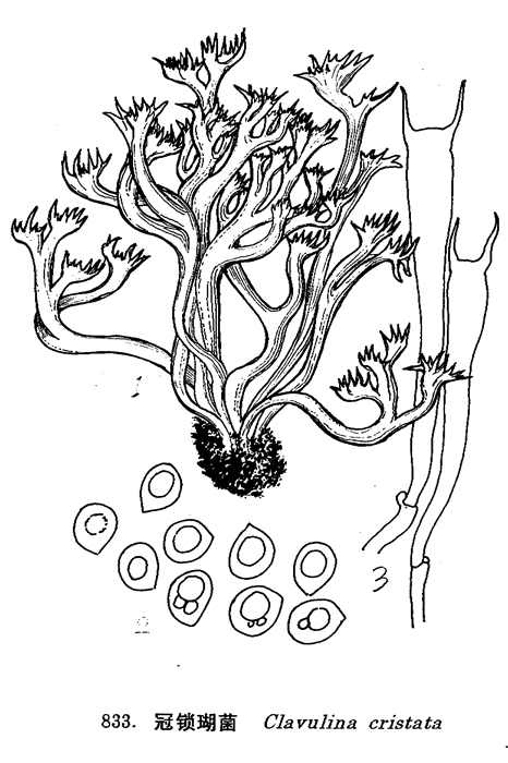 图 833 冠锁瑚菌 : 1. 子实体, 2. 孢子, 3. 担子