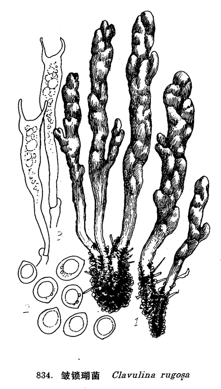 图 834 皱锁瑚菌 : 1. 子实体, 2. 孢子, 3. 担子