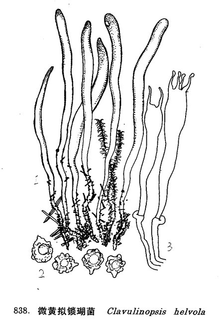 图 838 微黄拟锁瑚菌 : 1. 子实体, 2. 孢子, 3. 担子