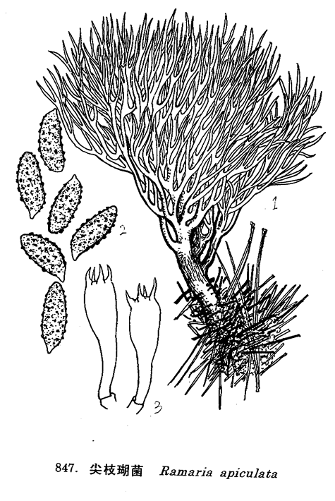 图 847 尖枝瑚菌 : 1. 子实体, 2. 孢子, 3. 担子