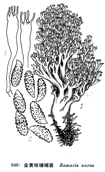 图 848 金黄枝珊瑚菌 : 1. 子实体, 2. 孢子, 3. 担子