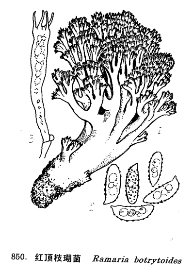 图 850 红顶枝瑚菌 : 1. 子实体, 2. 孢子, 3. 担子