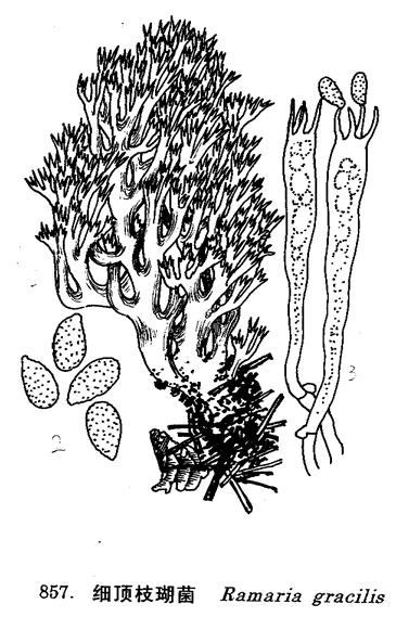 子实体小至中等,多次分枝而密。高3-10cm,宽2-5cm,上部分枝较短,白黄色,顶端小枝粗0.1-0.3cm,小枝呈齿状,2-3个一起似鸡冠状,下部赭黄色,黄褐色。基部色浅污白,被细绒毛。菌肉白色,质脆。担子长棒状,有锁状联合,无色,25-38μm×7-8μm。孢子无色,椭圆形或近似宽椭圆形,粗糙或小疣,浅黄色,5-7μm×3-4μm。图例