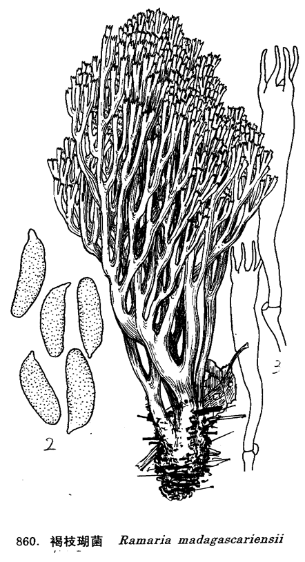 图 860 褐枝瑚菌 : 1. 子实体, 2. 孢子, 3. 担子
