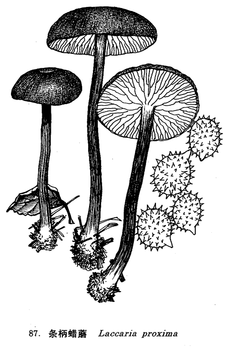 子实体一般较小。菌盖直径2-6cm,扁半球形至近平展,中部稍下凹,淡土红色,具细小鳞片,湿润时水浸状,边缘近波状,并具细条纹。菌肉淡肉红色,薄。菌褶淡肉红色,稀,宽,厚,直生至延生,不等长。菌柄细长,柱形,长8-12cm,粗0.2-0.9cm,同菌盖色或棕黄色,有纤维状纵条纹,具丝光,往往扭曲,内部松软,基部色浅并有白色绒毛。孢子无色,近卵圆形至近球形,具细小刺,7.6-9.5μm×6.3-8.1μm。图例