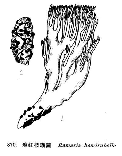 子实体较较大, 高8-13cm,宽5-8cm,中部分枝密,基部主轴粗而明显,末端渐稀疏,呈梨形。基部主轴高3-5cm,粗2-2.5cm,短而钝,近似胡萝卜形,并常弯曲。基部乳白色,白色,摸伤处出现黄色斑点。由主干向上呈2-3歧分叉,由粗而细,小枝3-6列,向上倾立,象牙白色,粉红色,紫红色,玫瑰红色,枝顶末端多双叉分,微弯曲,红色,橙红色,节间微缢缩。孢子印淡赭黄色。孢子狭卵形,9.4-11.5μm×4.3-5μm,孢壁厚0.2-0.3μm,具线条状突起,间以疣突,呈纵轴向排列,脐上区钝,芽管位于一侧呈乳头状突起。担子长棒状,45-60μm×7-9μm,小梗2至4枚。菌肉柔软,粉红色,有香味,生尝微甜。菌肉遇KOH液呈橙色,遇FCL液呈绿色。图例