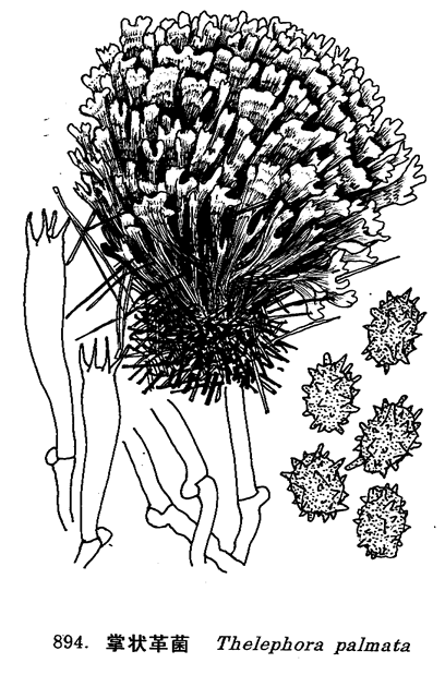 图 894 掌状革菌 : 1. 子实体, 2. 孢子, 3. 担子, 4. 菌丝锁状连合