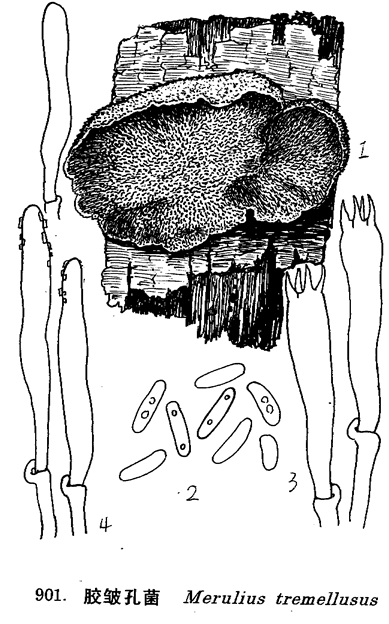 图 901 胶皱孔菌 : 1. 子实体, 2. 孢子, 3. 担子, 4. 囊体