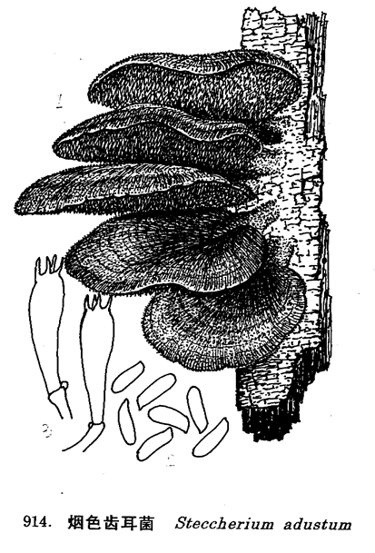 子实体较小,革质,有柄或近无柄。菌盖扇形、肾形至近圆形,直径2-5cm,白色至蛋壳色,有微细绒毛,边缘薄,波状,有不明显的环纹,往往暗色。菌肉白色,韧,厚0.1-0.6cm。柄侧生至偏生,长达2cm,粗0.3-0.6cm,同盖色,有细绒毛。菌盖下表面刺长1-3mm,往往扁至相互连接,初期白色,后变紫黑色至黑色,囊体瓶状或近长梭形,顶部有时有结晶。菌丝无色透明,粗3.5μm×4.5μm。担子近棒状,17-29μm×5.5-9μm 。孢子光滑,无色,短圆柱形或长椭圆形,2.5-3.5μm×1-1.5μm。图例