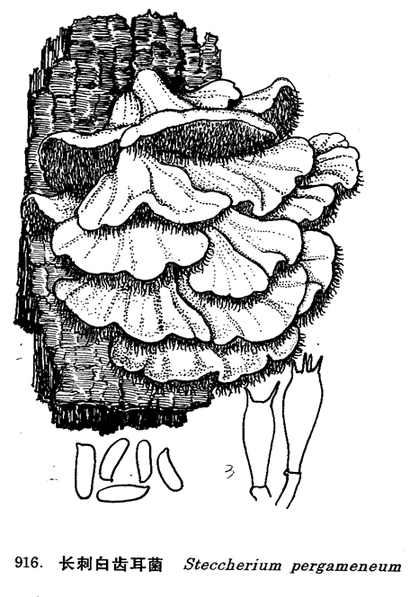 子实体中等大,扇形,薄,无柄至几无柄,4-8×5-10cm,厚0.2-0.6cm,边缘乳白色,光滑,干后海绵状,菌肉白色,薄。菌盖下子实层面白色,刺细长,柔软,密,锐尖,长0.1-1cm,粗0.05-0.1cm,干后变淡土黄色。孢子长圆,5-7×2-7μm,光滑,无色。菌丝无色,壁薄,直径5μm。图例