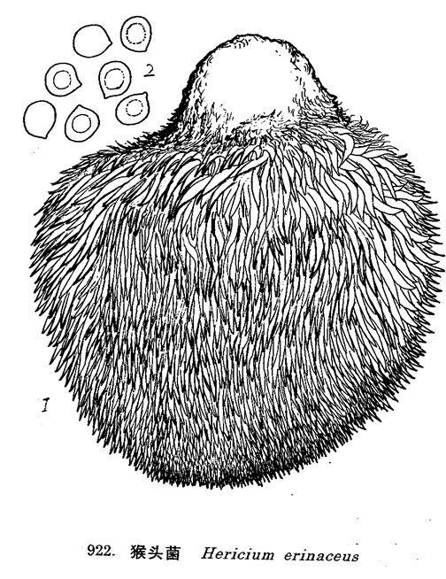 图 922 猴头菌 : 1. 子实体, 2. 孢子