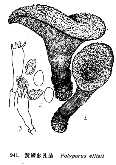 图 941 黄鳞多孔菌 : 1. 子实体, 2. 孢子