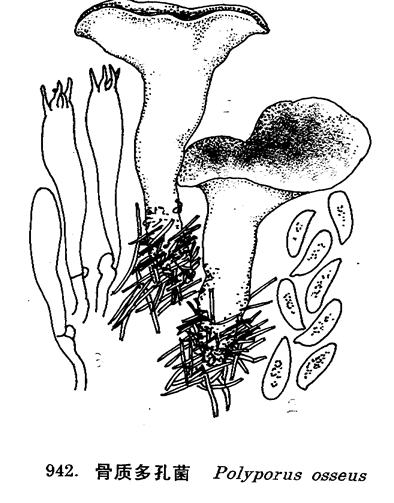 子实体中等至较大,有侧生短柄或仅有柄状基部。菌盖直径6-12cm×4-8cm,扁半球形,厚可达0.5-1.5cm。从生成覆瓦状,半肉质,含水汁多,干后硬而坚实,平滑,白色至污白色,干时带浅黄色,边缘薄而锐。菌肉白色,新鲜时软,干后坚硬,厚。菌管延生,长1-3mm,白色,干后呈浅黄色。管口多角形,每毫米3-5个。担子有4小梗,20-25μm×4-5μm,菌丝有锁状联合。孢子短柱形,光滑,无色,4-6μm×2-32.5μm。图例