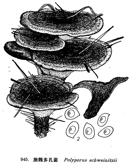 图 945 施魏多孔菌 : 1. 子实体, 2. 孢子