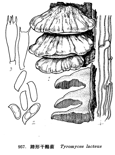 图 957 蹄形干酪菌 : 1. 子实体, 2. 孢子, 3. 担子, 4. 菌丝