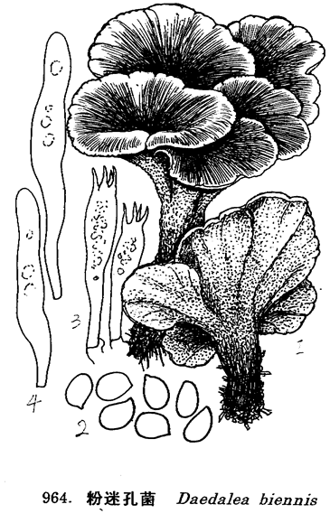 子实体中等至较大,一年生,近革质至革质。菌盖半圆形,3-7cm×3-12cm,厚1-2mm,米黄色至浅肉色,无环带,或有不明显环纹,有黄褐色绒毛,边缘薄锐且波浪状至瓣裂,菌肉白色至近白色,厚2-7mm,上层松软而下木栓质,无柄或有侧生或近中生的菌柄,长可达5cm。管孔多角形或迷路状至渐裂为锯齿状,白色,孔深2-4mm,孔径0.3-1mm。有囊体,近棒状。担子棒状,具4小梗。孢子椭圆形、卵圆形至近球形,无色,光滑,4.5-6.5μm×3.5-4.5μm。图例