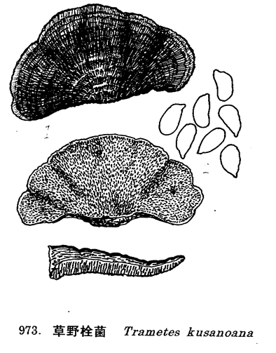 图 973 草野栓菌 : 1. 子实体, 2. 孢子