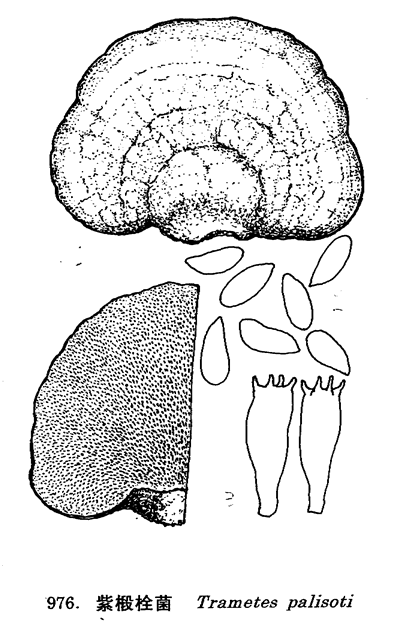 子实体无柄或近无柄,基部常狭缩成圆形,半圆形,肾形至扇形,扁平,一年生,3.5-10cm×4-17cm,厚0.5-1.3cm,无毛,有不明显的棱纹,白色至玉米黄色,有明具褐色或暗红色的污染,边缘薄,锐或稍钝,全缘或波浪状至瓣裂。菌肉白色,厚0.15-0.8cm。菌管同色,长2-5毫米。管口迷路状,与菌盖表面色相近,宽0.3-0.5毫米,管壁完整。担子棒状, 具4小梗。 孢子长椭圆形,光滑,无色,5-7μm×2.5-5图例