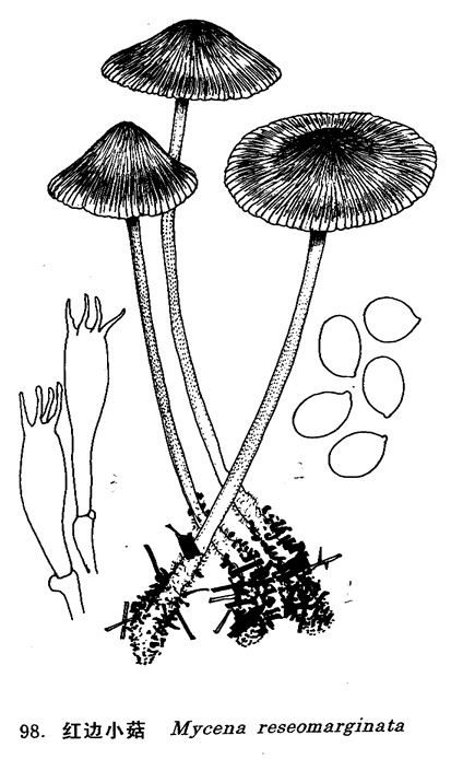 图 98 红边小菇 : 1. 子实体, 2. 孢子, 3.缘囊体