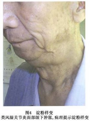 (2)皮肤:病变活检标本于光镜下可见表皮变薄,乳头变平,胶原纤维束水肿,在皮下脂肪、汗腺和皮脂腺内可见淀粉样物质沉着。