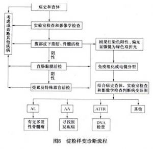 淀粉样变是不同种类的蛋白质沉积于组织器官而引起的疾病,形成淀粉样物质的各种蛋白质都有相应的正常蛋白质前体,逐渐形成了目前以沉淀物质种类进行分类的分类方法。淀粉样变的临床表现多种多样,主要取决于淀粉样变性的类型和受累及的组织器官。病理组织学检查是诊断本病的金标准,刚果红染色阳性,在偏振光镜下为绿色双折光可以诊断。诊断流程如下(图8)。