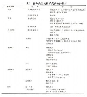 系统性淀粉样变患者常有器官严重损害和功能不全,所以一般需要对症、支持和替代治疗。支持治疗对保护或改善重要脏器功能,提高生存质量,延长生存时间,以及为特异性争取时间有重要意义。推荐的支持治疗详见表6。