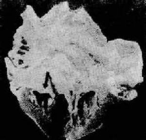 病变早期表现为浆液性心内膜炎,瓣膜肿胀、透亮,但尸检时这种早期变化几乎看不到。镜下,瓣膜因浆液性渗出物而变得疏松,伴有巨噬细胞的游入,胶原纤维发生纤维素样坏死。其后,坏死灶周围出现Anitschkow细胞,严重病例可有Aschoff小体形成(图2)。几周后,在瓣膜闭锁缘上有单行排列的,直径为1~2mm的疣状赘生物(verrucous vegetation)。此种心内膜炎又称为疣状心内膜炎(verrucous endocarditis)。这些疣赘物呈灰白色半透明,附着牢固,一般不易脱落(图8-21)。镜下,疣赘物为由血小板和纤维素构成的白色血栓。疣赘物主要发生于二尖瓣的心房面和主动脉瓣心室面,其原因:由于瓣膜炎症波及内皮细胞使之受损伤,同时由于心瓣膜不停地关闭和启开,闭锁缘处内膜经常受到摩擦和血流冲击,使受损内皮细胞脱落,内皮下胶原裸露,因而导致血栓形成。有时,左心房壁亦有血栓形成。