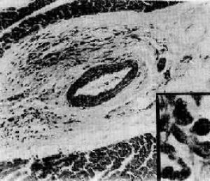 心肌间质中血管旁可见群集的Anitschkow细胞(Aschoff小体),小体已有部分纤维化。右下角为Anitschkow细胞的高倍放大照片,其核状似枭眼