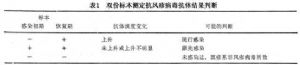 (5)若为阳性结果,可将样品作进一步稀释后作抗体滴度测定,比较先后两份样品结果,并进行判断(表1):