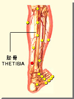 穴下为皮肤、皮下组织、趾长屈肌、胫骨后肌。深层前方有胫后动、静脉。分布着腓肠内侧皮神经和小腿内侧皮神经,深层为胫神经。皮肤由隐神经的小腿内侧支分布。隐神经是股神经中最长的一支。该神经自股三角内下降,经其尖进入股管。在该管的下端,与膝最上动脉共同穿股收肌腱板,离开该管;继在膝内侧缝匠肌和股薄肌之间,穿深筋膜,伴大隐表脉下降至小腿内侧,至小腿下三分之一处,分为二支:一支继续沿胫骨内侧缘下降至内踝;另一支经内踝的前面,下降至足的内侧缘。隐神经可与腓浅神经的足背内皮神经结合。上述的趾长屈肌和胫骨后肌等由胫神经的肌支支配。