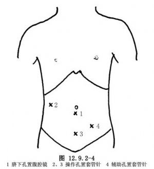 置入腹腔镜后依次窥视上腹部,右下腹部,左下腹及盆腔情况,有无副损伤,腹腔及阑尾周围炎症情况。在腹腔镜监视下,于右腋前线,盲肠上穿刺置入直径5mm或2mm套管,放入无损伤抓钳。在耻骨联合上方膀胱顶置入直径5mm套管,该孔可放置抓钳,电凝钩,吸引器及微型镜。如阑尾位于盲肠后位,手术暴露困难,可于耻骨联合穿刺点左侧再置入5mm套管(图12.9.2-4)。