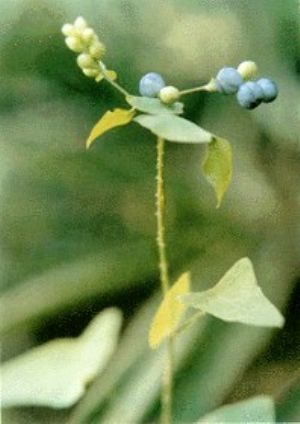 植物形态 多年生蓼生草本。茎有棱,红褐色,有倒生钩刺。叶互生,盾状着生;叶片近三角形,长4~6cm,宽5~8cm,先端尖,基部近心形或截形,下面沿脉疏生钩刺;托叶鞘近圆形,抱茎;叶柄长,疏生倒钩刺。花序短穗状;苞片圆形;花被5深裂,淡红色或白色,结果时增大,肉质,变为深蓝色;雄蕊8;花柱3裂。瘦果球形,包于蓝色多汁的花被内。花期6~8月,果期9~10月。