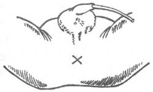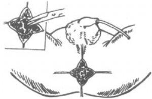 ㈠切口:在会阴中央或可激发环形收缩区的中间,做X形切口,长约1.5cm。切开皮肤,翻开4个皮瓣,其下方可见环形外括约肌纤维。