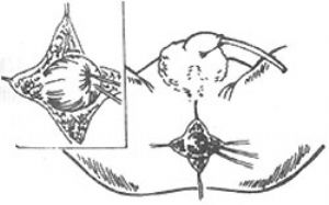 ㈡寻找游离直肠盲端:用蚁式血管钳经括约肌中间向深层钝性分离软组织,可找到呈蓝色的直肠盲端,在盲端肌层穿2根粗丝线作牵引。因直肠盲端正位于耻骨直肠肌环内,因此应紧贴肠壁向上分离。游离盲端约3cm,使直肠能松弛地拉至肛门口。游直直肠一定要有足够的长度,如不充分游离而勉强拉下缝合,术后极容易发生肠壁回缩,造成瘢痕性狭窄。分离时还应避免损伤尿道、阴道和直肠壁。