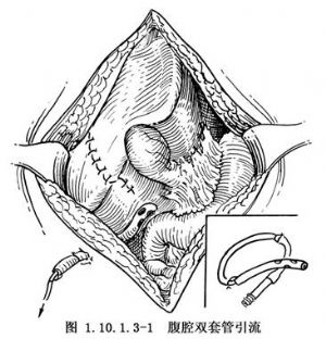 6.保持腹腔引流通畅 肝脏术后的引流是治疗中极为重要的环节,在术后护理中务必保证双套管负压吸引通畅并不能脱落。否则,常因引流不畅或引流管过早脱落,而腹腔内未达到充分引流,发生膈下或肝下化脓性感染。腹腔引流一般在术后3~5d拔除。若有胆汁外溢时,需持续双套管负压吸引(图1.10.1.3-1)。T形管引流可于手术后2周左右造影后拔除,如遇胆瘘发生可适当延长拔管时间。