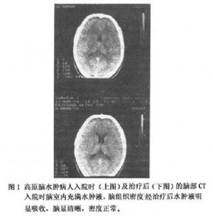 颅脑CT检查Kobayashi报告9例高原肺水肿合并脑水肿的CT检查,发现有8例脑室容量降低,脑实质密度增强,表现为大脑白质水肿(图1);治愈几周后复查,都恢复正常。