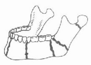 图4-14 颏孔部骨折后骨折段移位情况