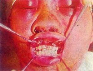 2.牙齿咬合错乱:上下牙齿的咬合关系常因颌骨骨折段移位而发生错乱,这是颌骨骨折最明显的症状,对诊断颌骨骨折有很重要的意义。上颌骨横断骨折(附图24),骨折段向下移位,使上颌后牙与下颌后牙发生早接触,使前牙呈开牙合状态。下颌骨骨折后,多因骨折段移位,出现牙齿的咬合关系错乱。若无骨折段移位,则牙齿咬合无明显错乱。
