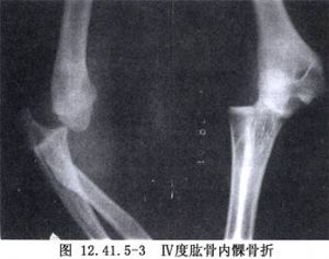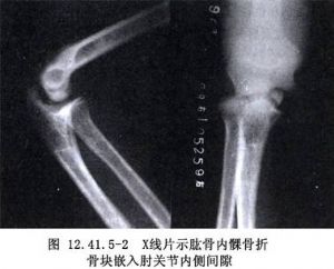 肱骨内髁骨折切开复位术用于肱骨内髁骨折的治疗。肱骨内髁骨折罕见,占儿童肘部骨折1%以下。多见于8~14岁儿童(图12.41.5-1~12.41.5-3)。