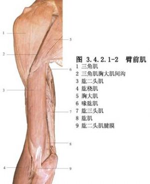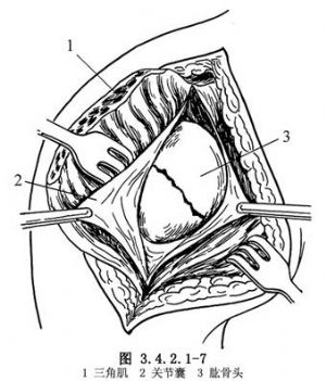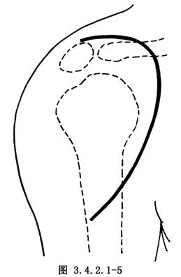 1.切口起自肩峰沿锁骨外1/3经喙突后,再沿三角肌与胸大肌间沟向下,止于三角肌止点上方(图3.4.2.1-5)。